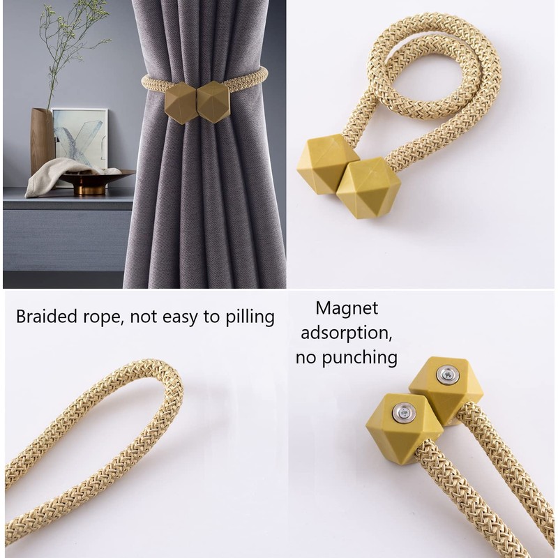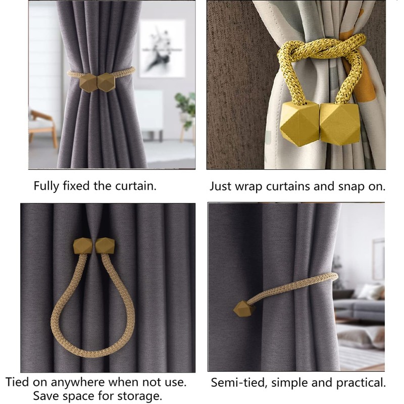 - ★【STRONG MAGNETS,SIMPLE,CONVENIENT】Magnetic Curtain Tiebacks Clips-Do not need hook,punch and install,damaging wall of the home,the magnet is strong and durable will not fall down.Covered by decorative weave rope to protect your draperies,the thread has high strength,strong toughness,is not easy to fall off,wear or pilling,Magnetic curtain tiebacks clips adding a modern beauty to your windows.