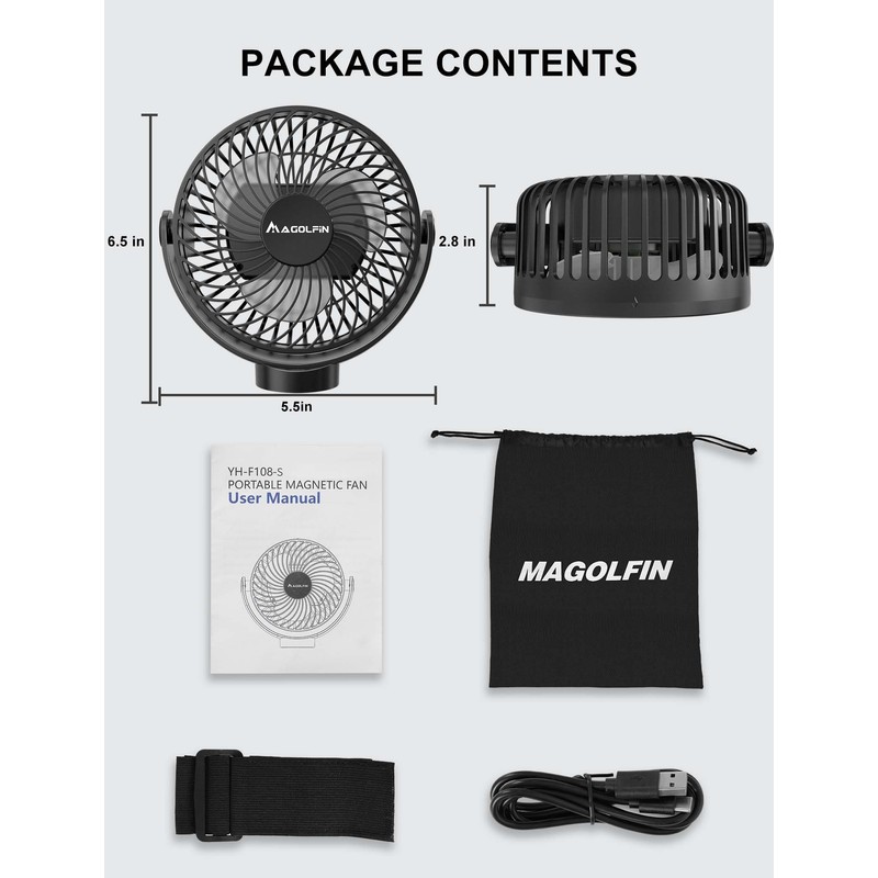 - 【Powerful Magnetic Base for Secure Attachment】This magnetic fan features a 1-inch big magnet that firmly adheres to any metal surface for effortless one-touch installation and removal. An additional elastic strap ensures double security, preventing falls during bumpy golf cart rides. A must-have golf cart accessory, allowing you to stay cool and comfortable on the course.
