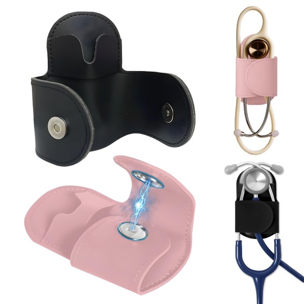 Magnetic Stethoscope Holder Clip 2-Pack (Black & Pink) - Secure Hands-Free PU Leather Holster for Physicians, Nurses, EMT, Students - Fits 3M Littmann & Most Stethoscopes