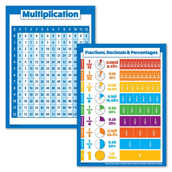 Palace Learning 2 Pack - Multiplication Table Poster & Fractions, Decimals and Percents Chart (LAMINATED, 18" x 24")