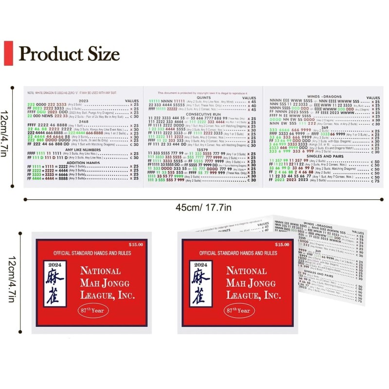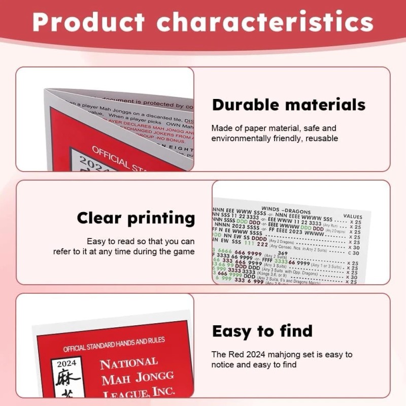 - 【MAIN FUNCTION】The mahjong cards are clearly printed and easy to read, and contain detailed 2024 version of the Mahjong League hands and rules so that you can refer to them at any time during the game.