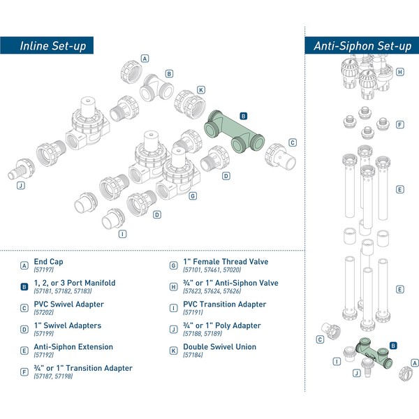 This Orbit 57182 two-valve manifold easily extends a single sprinkler manifold system into a three-valve manifold or it can attach to a three-valve manifold to create a five-valve manifold sprinkling system. This Orbit sprinkler manifold easily connects without tools, just hand-tightening for attachment to another sprinkler valve. O-rings on all openings ensure watertight connection to prevent leaks. With high-impact, UV-resistant construction, this two-port sprinkler valve manifold ensures m...