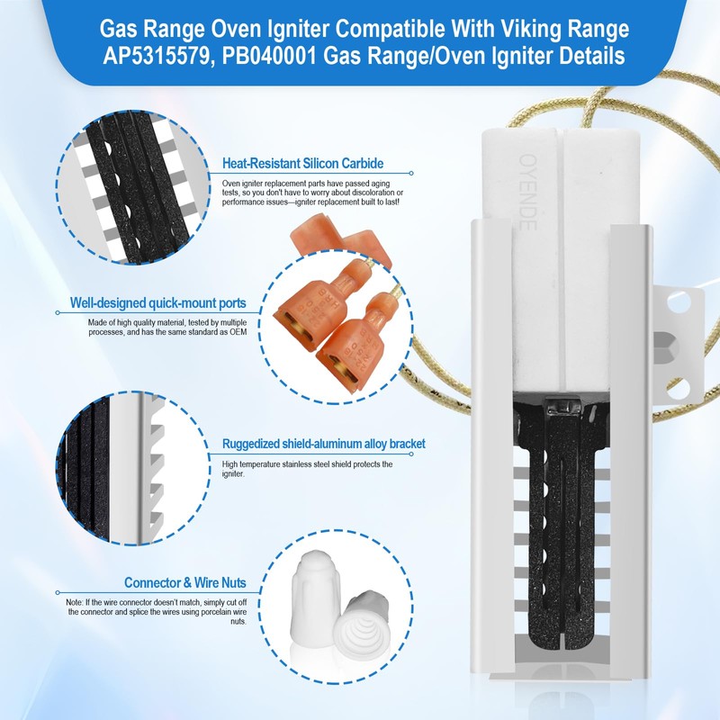 - Oven Igniter Perfect Compatibility and Function: The PB04001 Fit for viking gas range oven,replace part number: AP5315579 065650-000 PB04001 792263. Oven igniter replacement can help fix an oven that is not heating due to an igniter failure. If your oven won't heat up or heats up abnormally, you need to replace your old oven igniter to extend the life and maintain the efficiency of your oven.