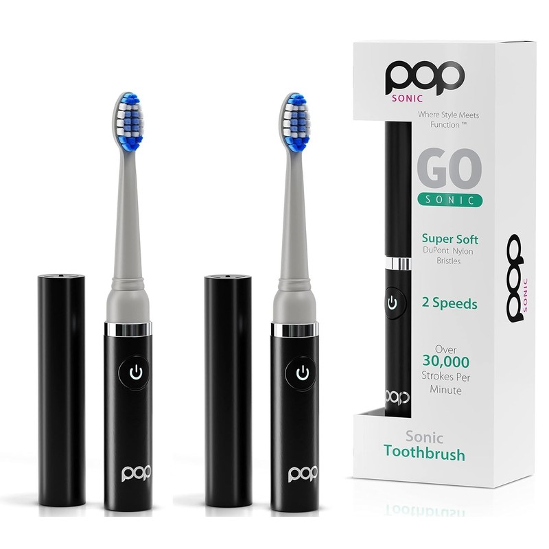 - Battery Toothbrush for Adults & Kids: Keep your teeth clean and breathe fresh all day long with our 2-Pack Black Go Sonic toothbrush by Pop Sonic. This 7” tall vibrating Sonic travel toothbrush features 2 speeds with vibrations from 15000 to 30000 brush strokes per minute.