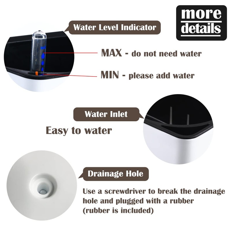 - Plant Pots with Drainage Hole and Water Level Window: Designed with a plugin the location of the drainage hole for easy disposal of excess water and rainwater accumulation. You can clearly see the water level through the water level indicator, which reminds you when to water your plants. You don’t have to take out the inner plastic pots, just pour the water directly from the water inlet.