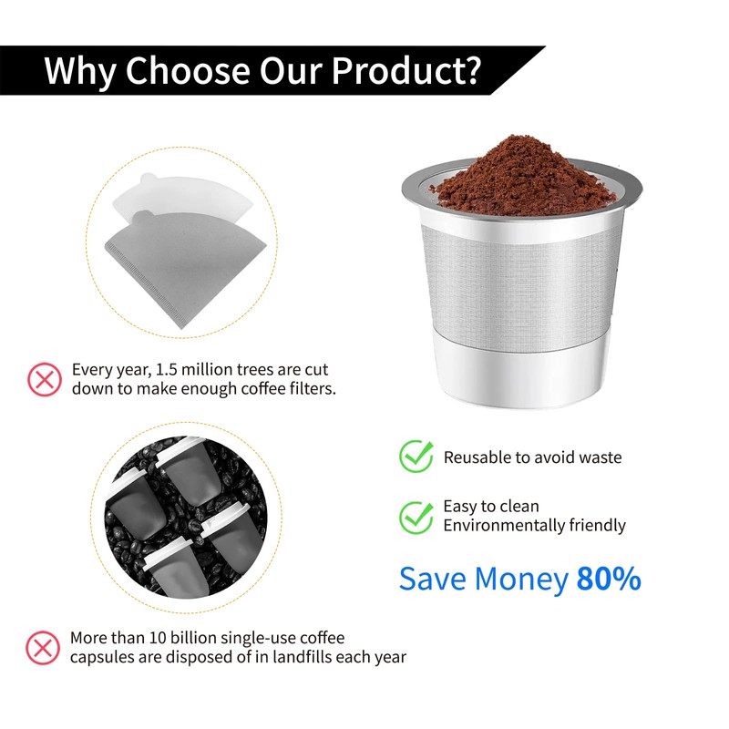• Eco-Friendly Choice: Save over 100 plastic pods monthly with our food-grade 304 stainless steel K-cups. By replacing disposable paper filters and plastic capsules, you contribute to reducing waste and protecting marine life.
