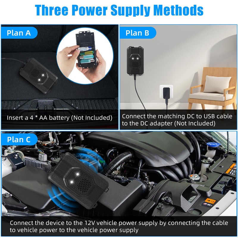 - Three Power Supply Modes: The mouse repellent offers three convenient charging options.1.Powered by 4 AA batteries,2.Charged via a USB cable connected to a 5-12V adapter,3.Powered using a DC cable connected to the car's under-hood power supply