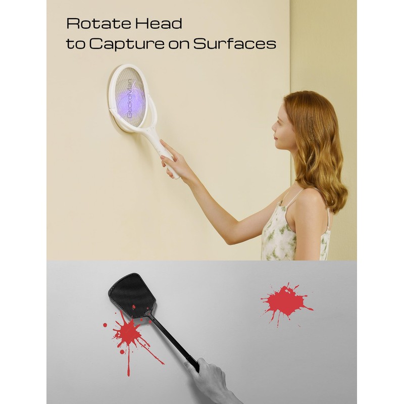 - 【👍 Patented Rotating Head Design】Our electric fly swatter features an innovative rotating head design, facilitating easy bug catching from various angles and surfaces, including walls. You can also lock the head of the electric fly swatter and swing it in the air to capture flying insects, just like traditional electric fly swatters.