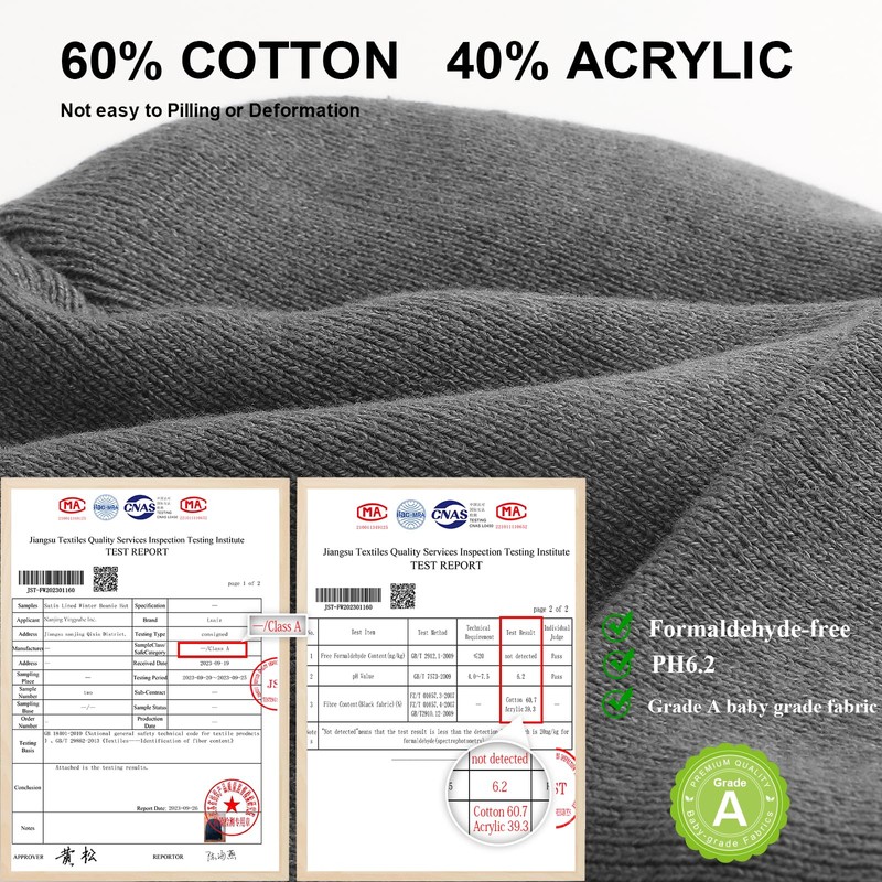 - MATERIALS AND FEATURES: The outer layer of this winter beanie hat is made of 60 % cotton and 40 % acrylic fabric, and the inner layer uses silk satin lining. The external makes the men beanie more fashionable while getting elasticity, and the interior makes the hair more comfortable. The combination of fabrics provides superior comfort and insulation for the beanie. The satin beanie is designed to help keep your head and ears warm during cold days.