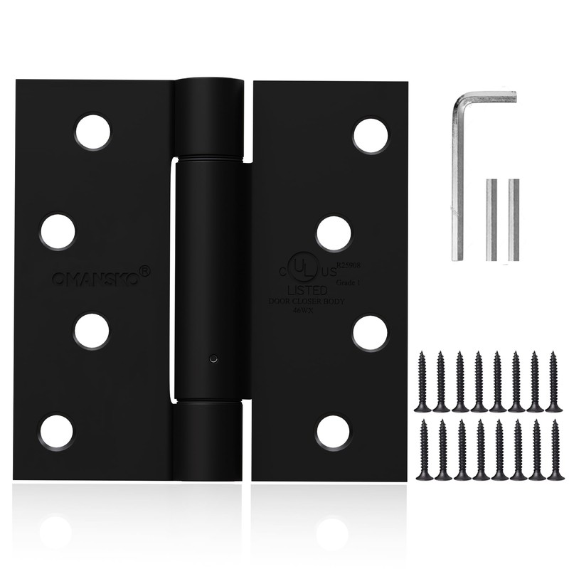 - 【Safety Certification】Matte black spring loaded hinges have UL certification. We care about your quality of life. The auto door closer hinge center axis includes damping oil function, which aims to reduce friction between metals. It is made of high-quality iron, waterproof and rust proof, and can last for a long time.