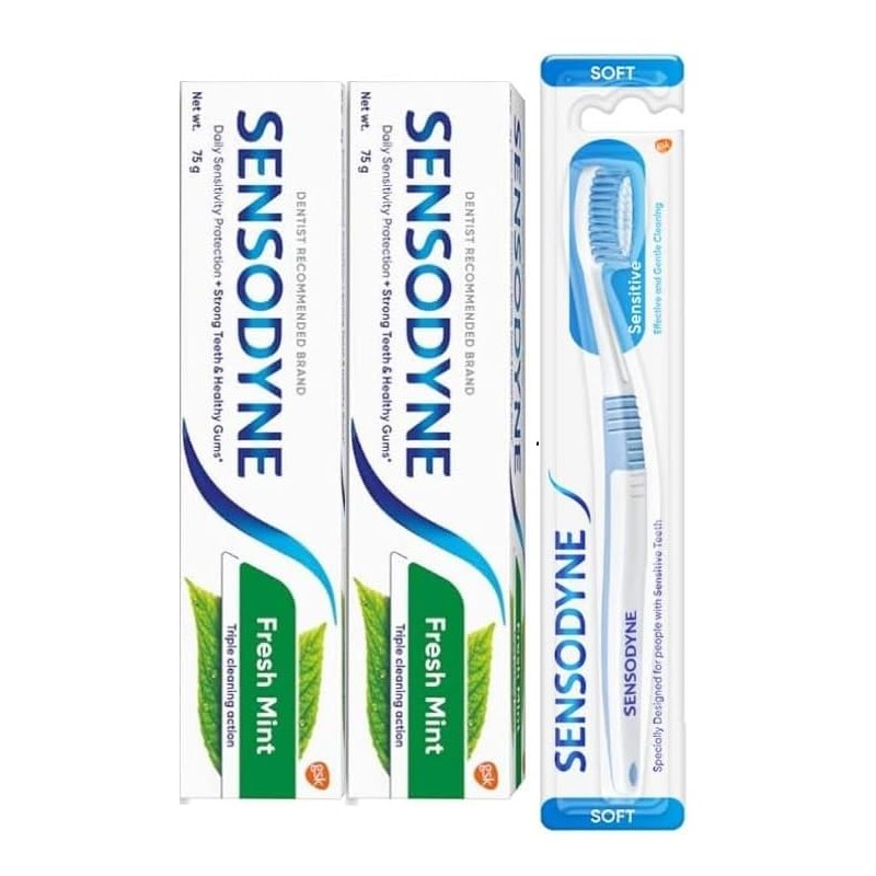 - The bundle includes: 2 Packs of Sensodyne Fresh Gel Toothpaste 75g (2.64 oz ) and a Sensodyne Sensitive Soft Toothbrush