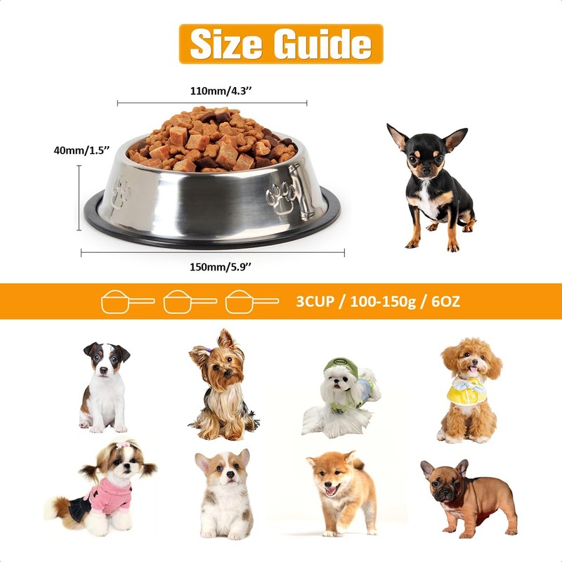 - Anti-skid Dog Bowl: This stainless steel dog bowl with anti-skid rubber bottom can effectively reduce the noise and slipping when your lovely pets in eating, and it can also protect home wood floor from scratching