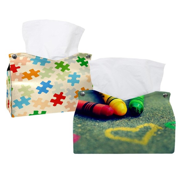 2 Pack Tissue Box Cover Holder, Rainbow Crayon Love Heart Rectangle Leather Tissue Case, Decorative Organizer for Tabletop, Bathroom, Car, Office