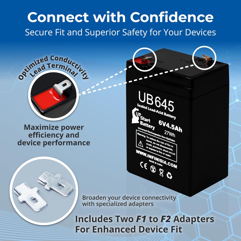 - ππππ ππππππππππππ & ππππππππ πππππ - Features standard F1-style terminals for quick connection; may require minor adjustments for precise fit. Provides dependable backup power for emergency lighting, camping, exit signs, and more. Ideal for 6v4ah 20hr rechargeable battery applications. Includes two F1 to F2 adapter for universal fit.