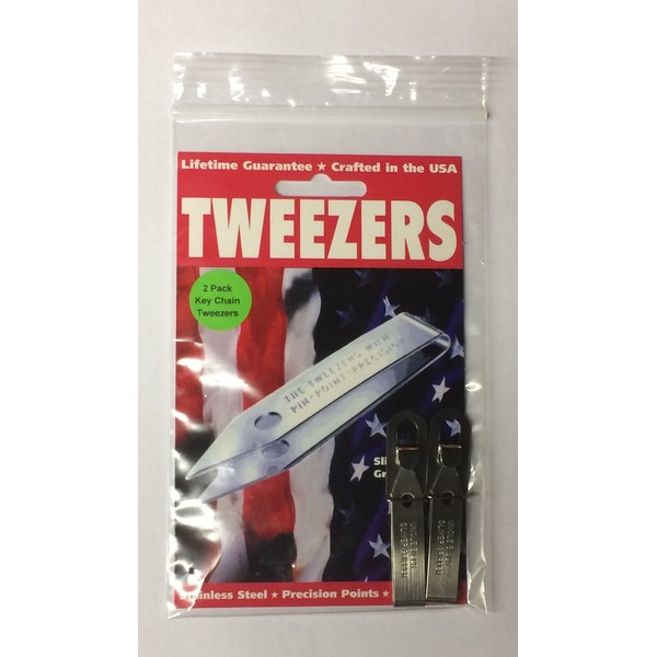 Two (2) of the Finest, made in USA, Spring-tempered stainless steel construction tweezers in the world. - keeps perfect alignment. Precision ground points provide pin-point gripping. Ideal for small parts, boats, fishing and sewing. Easily removes the tiniest of splinters, thread, hair, stingers, stitches, etc. Packed on a key chain clip for convenient and easy attachment to your key ring. Hang packaged. Made in the U.S.A. Manufacturer's Guarantee. If not completely satisfied, return for replacement or refund.