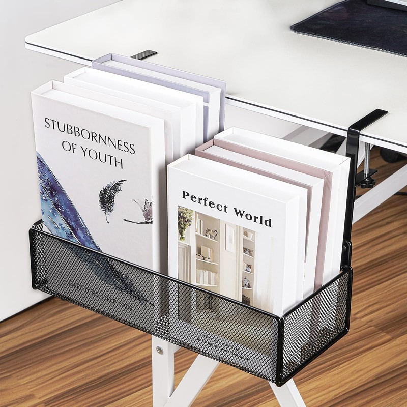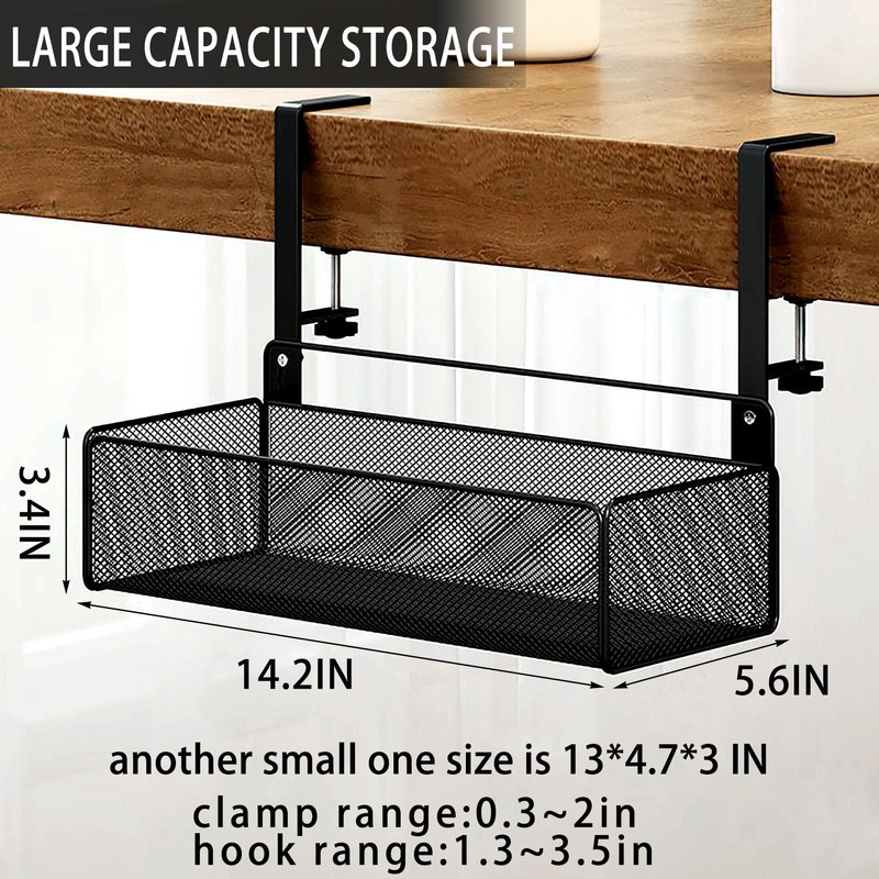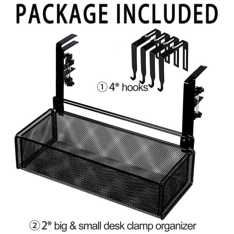 - Easy to install: No drilling, no need to worry about damaging the tabletop. 1.CLAMP Mounting with two clamps, clamp range:0.3~2in, attach the clamp to the mesh basket and then attach the bracket to the desk, can be clipped around the table/desk. 2. HOOK Mounting, suitable for most panels with with 1 3/8 in to 3 1/2 in thickness, hanging on the foot of bed, cubicles of office, baby bed rails.