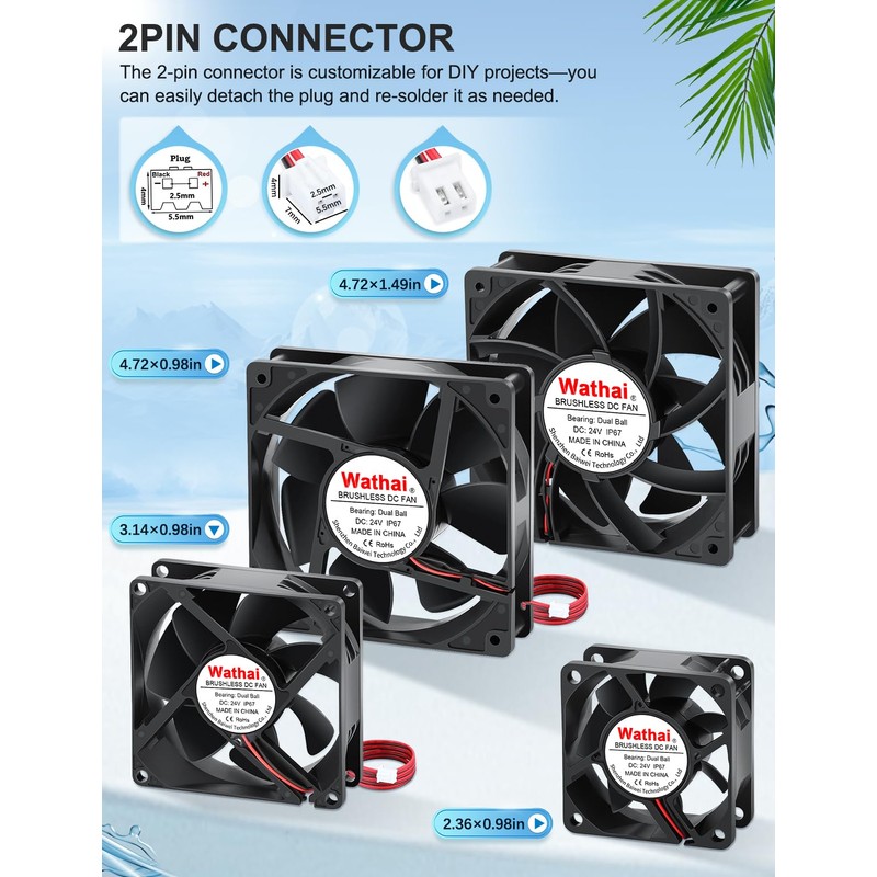 2 Pack Wathai IP67 Waterproof 24V DC 120mm x 25mm Cooling Fan Dual Ball High Proformance for Computer Case, Plasma Cutting, Ice Maker Replacement 24 Volt Fans