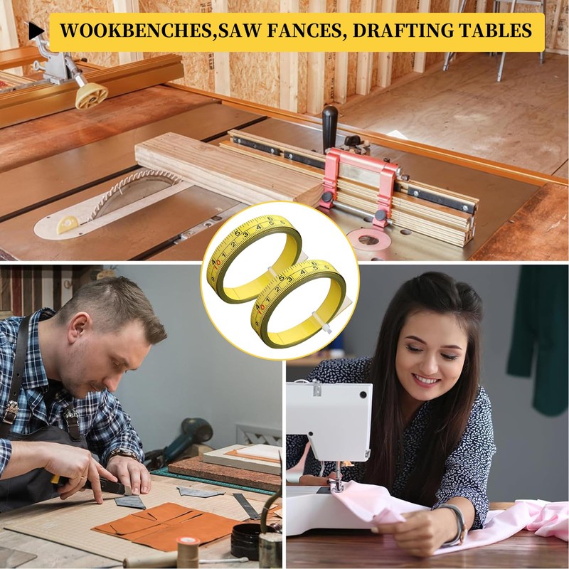 Stick on tape measure with self-adhesive backing, it can be stuck to almost any work surface for easy measuring, such as a workbench, sewing machine, drafting table, saw fence, craft table, T-track or anywhere else.