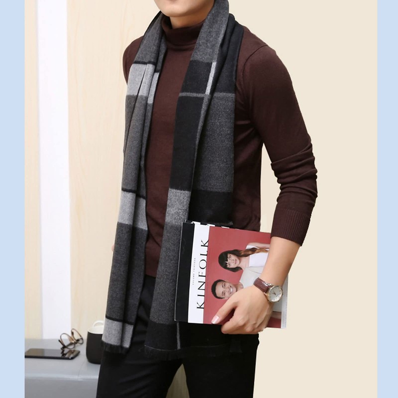 2 Packs Cashmere Feel Men Scarf for Winter, Lattice Grid Plaid Stripe Argyle Windowpane Designs Selection Husband Father Gift (Assorted Rectangles/Black + Grey)