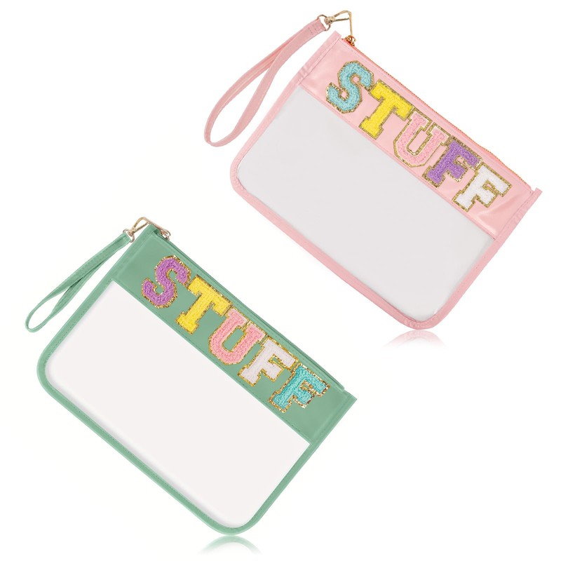 2 Packs Chenille Letter Clear Bag, Waterproof PU&PVC Transparent Chenille Letter Patch Zipper Clear Pouch with Wrist Strap, Travel Essentials Stuff Bags for Women (Pink, Green)