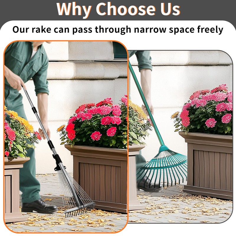 - Expandable Head (8"–15") – The leaf rake’s head expands from 8 to 15 inches, making it perfect for raking in narrow spaces and large lawns alike. Quickly adjust the width for flexibility in your yard cleanup.