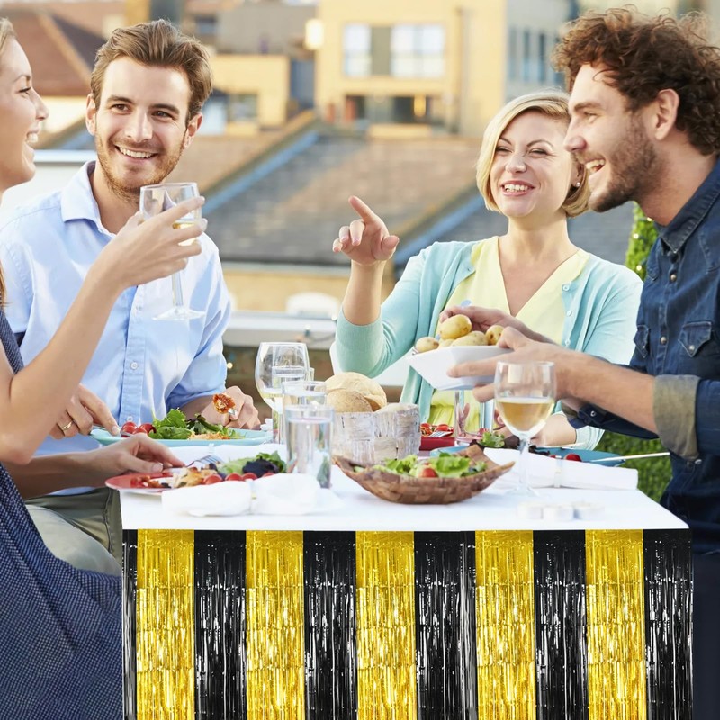 - 【The package includes】: 2-Pack Black Gold Metallic Tinsel Foil Fringe Table Skirt 29x108 inches, enough to decorate your party, provide you with outstanding decorations to lighten up the party atmosphere.