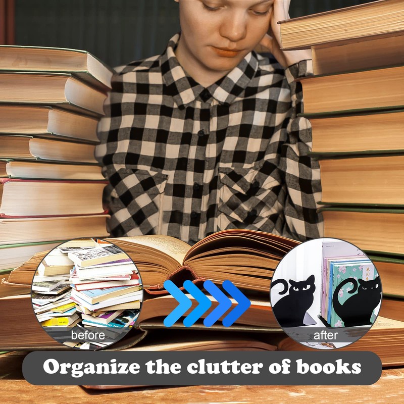 - Cat Design The bookends are designed in the shape of a cat and have a smooth, rustproof, black painted surface. The metal book holders are both functional and decorative and therefore fit most living and office furnishings.