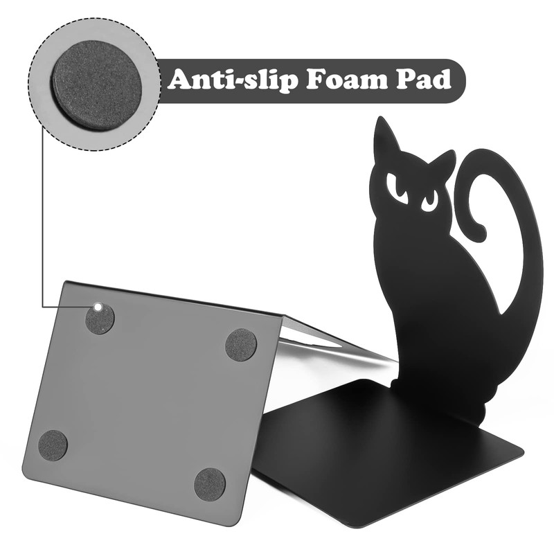 - Cat Design The bookends are designed in the shape of a cat and have a smooth, rustproof, black painted surface. The metal book holders are both functional and decorative and therefore fit most living and office furnishings.