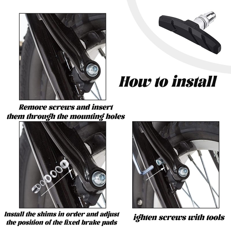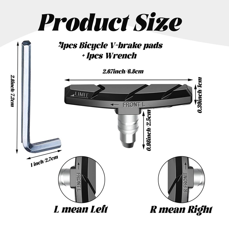 • Bicycle Brake Blocks Set: 2 pairs V Bike Brake and an L-shaped hexagonal spanner, For installation and removal. They are great replacements for worn bike break pads