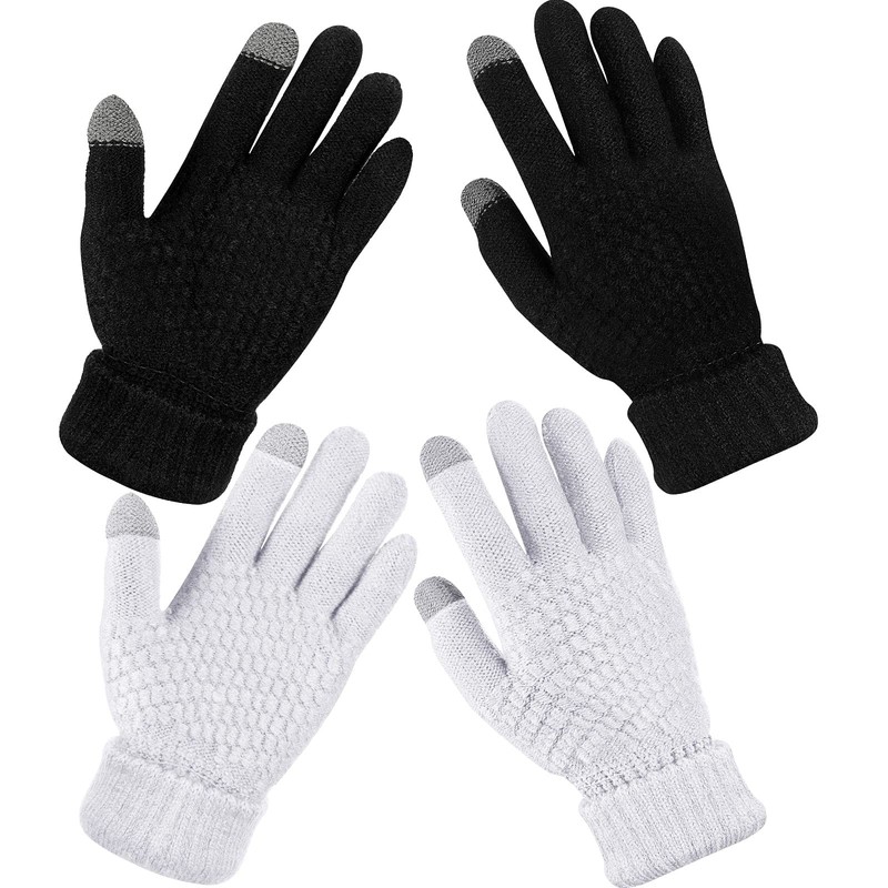 2 Pairs Women's Winter Touchscreen Gloves Warm Fleece Lined Knit Gloves Elastic Cuff Winter Texting Gloves (Black, White)