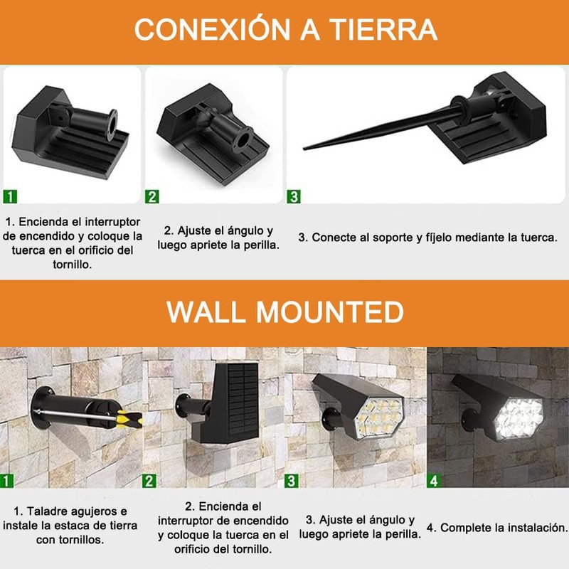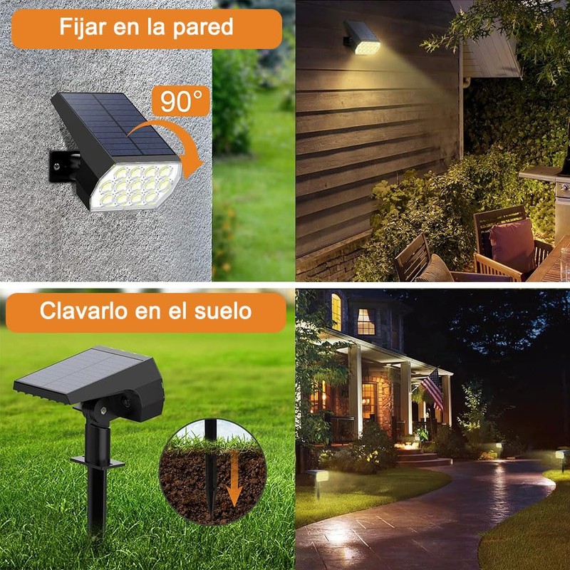 - 💡 【2 en 1 de Fácil Instalación】Focos solares para paisaje: ①Modo de montaje en pared, ②Modo de inserción en el suelo.Se puede instalar en una pared como luz de cobertizo, usarse como luz de inundación o como luz de paisaje en el suelo.Adecuado para exteriores, jardín, garaje , balcón, camping, paisaje, etc.