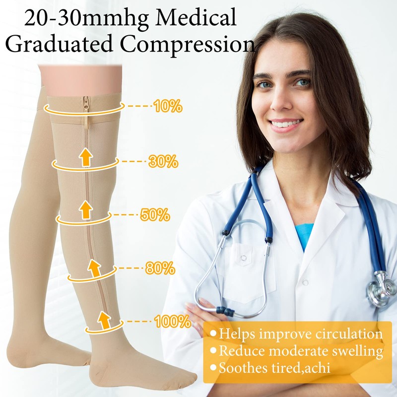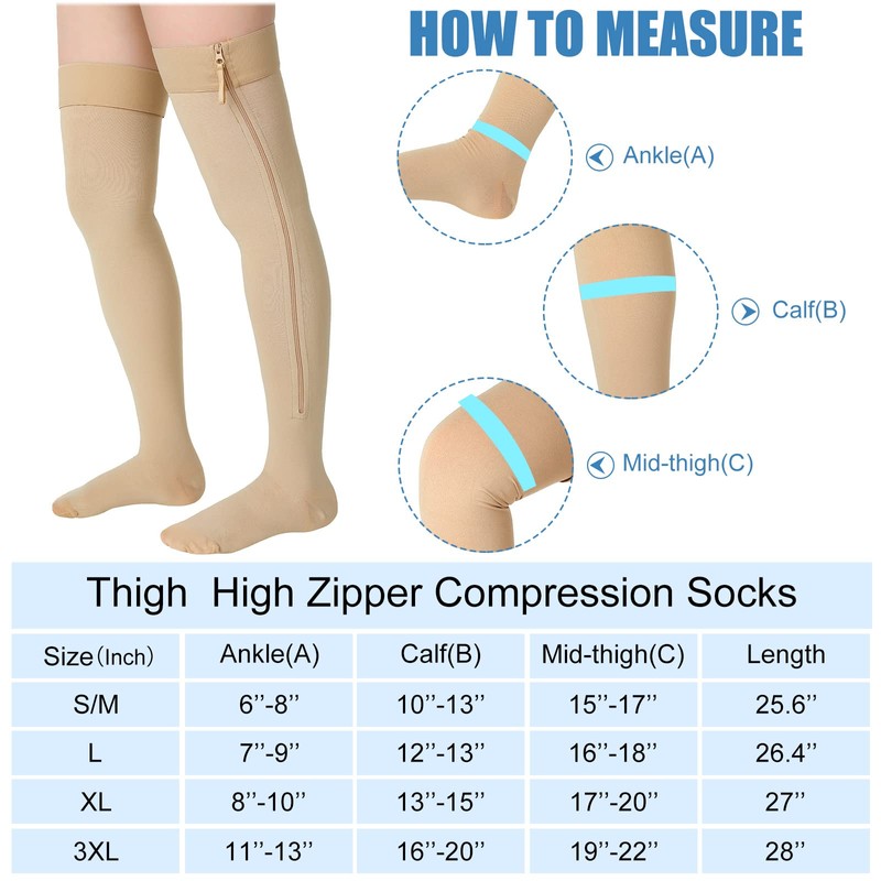 - Qué incluye el paquete: hay 2 pares de calcetines de compresión con cremallera de punta cerrada hasta el muslo en el paquete, de color beige, que son suficientes para satisfacer su uso diario y el reemplazo; Estas medias de compresión con cremallera son adecuados tanto para hombres como para mujeres