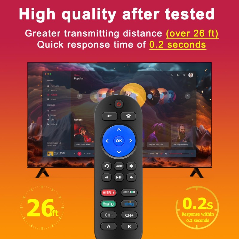 - [Nice Remote Control]Our remote has been upgraded to give you a greater transmitting distance (over25 ft) and has a quick response time of 0.3 seconds,and the keys have been tested to support over 120000 click.With 4 shortcut keys, you can directly access your favorite streaming channels.