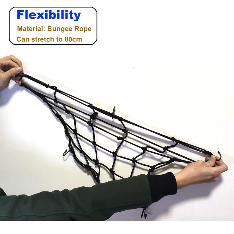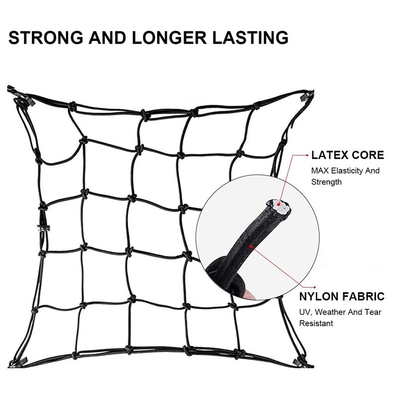 - The cargo net easily stretches to 30"x30" to load more items,offers you unparalleled elasticity and durability even in tough and extreme weather conditions