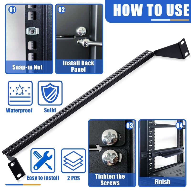 - Easy to Assemble Rack Support Bar: only 4 screws and nuts are required for each rack cable management rail, and the cable ties are passed through the 2 adjacent small holes, and the cables that need to be organized are placed on them to secure the cable ties; The installation process is simple and quick, the matte texture is comfortable to touch, will not break to your rack cabinet, and offer you a good using experience