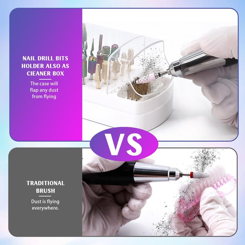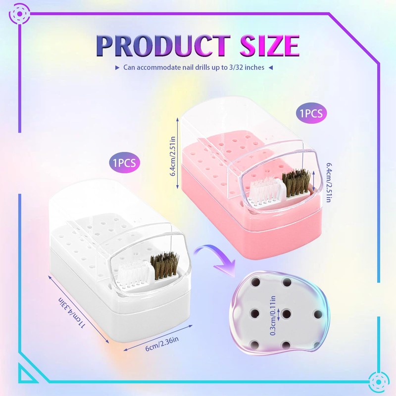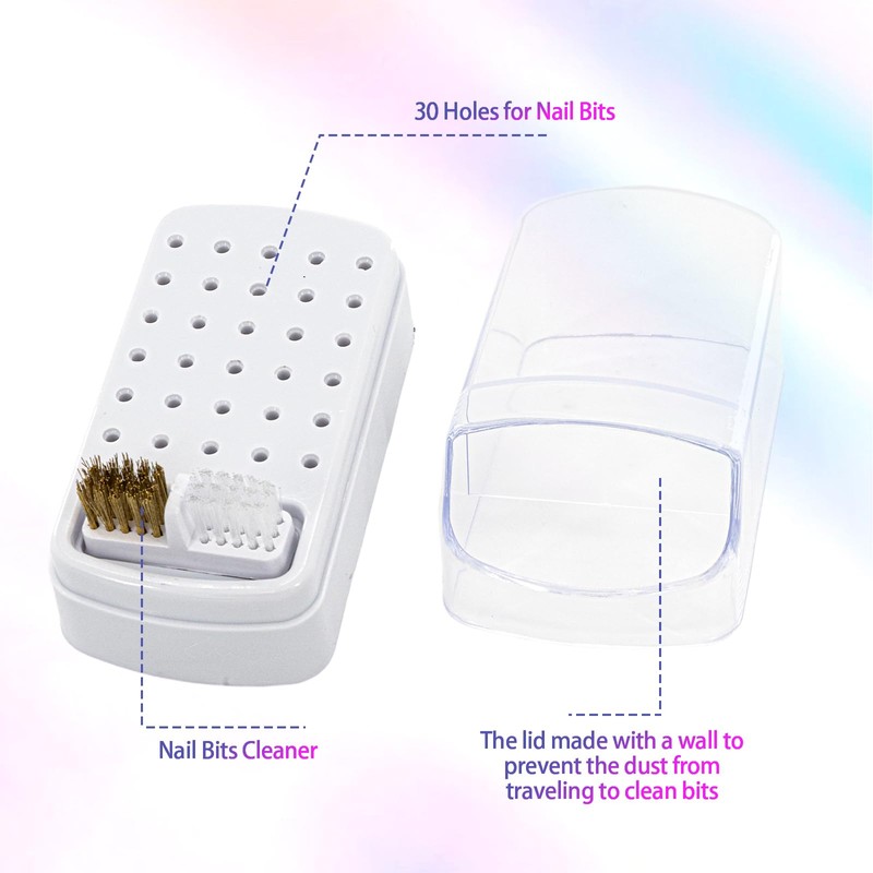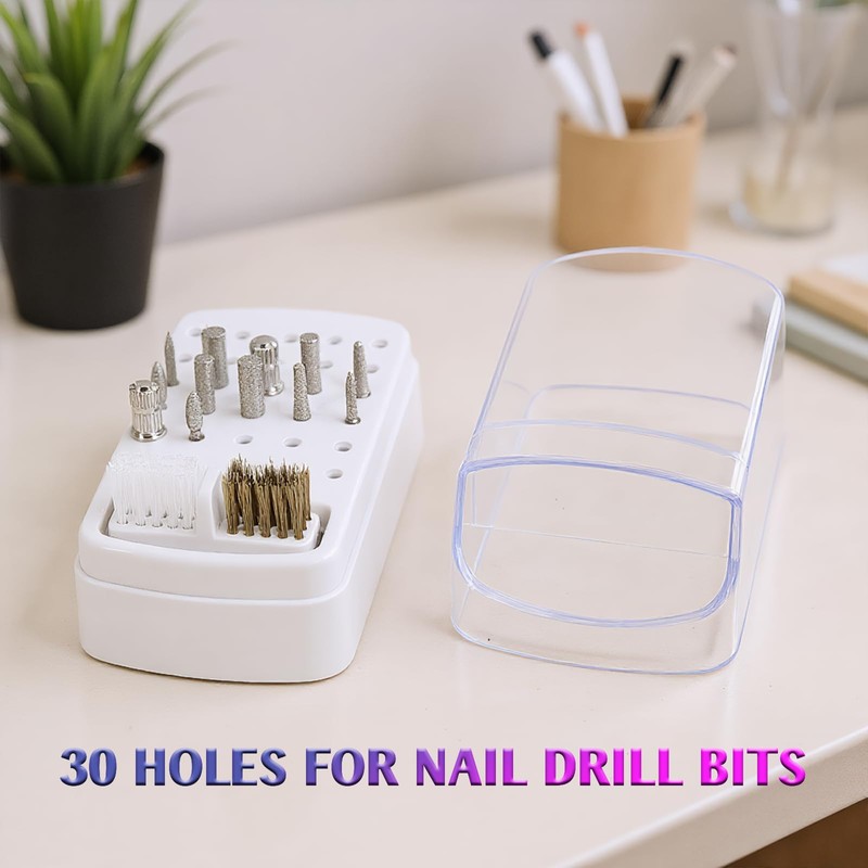 - 1. Nail Drill Bits Holder Collector Display Case: The nail drill bit holder is designed with 30 precision holes to accommodate a variety of 3/32'' drill tips. This compact and efficient design will declutter your workspace and save your valuable time by keeping your tools neat and within reach. Drill bit case with clear lid makes it easy to see at a glance where each bit is. A must-have for any professional nail tech, this nail bit holder accessory will keep your station tidy.