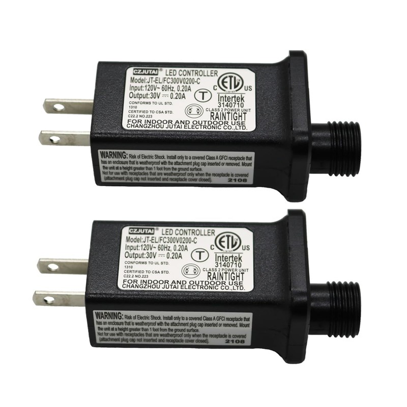 - Model:JT-EL/FC300V0200-C Input: 120V, 60HZ, Output: 30V, 0.2A, 6 Watts.This adaptor fits for 30V low voltage led device with current under 6 watts, such as Christmas String Lights, Copper Wire Light, Projector Light.