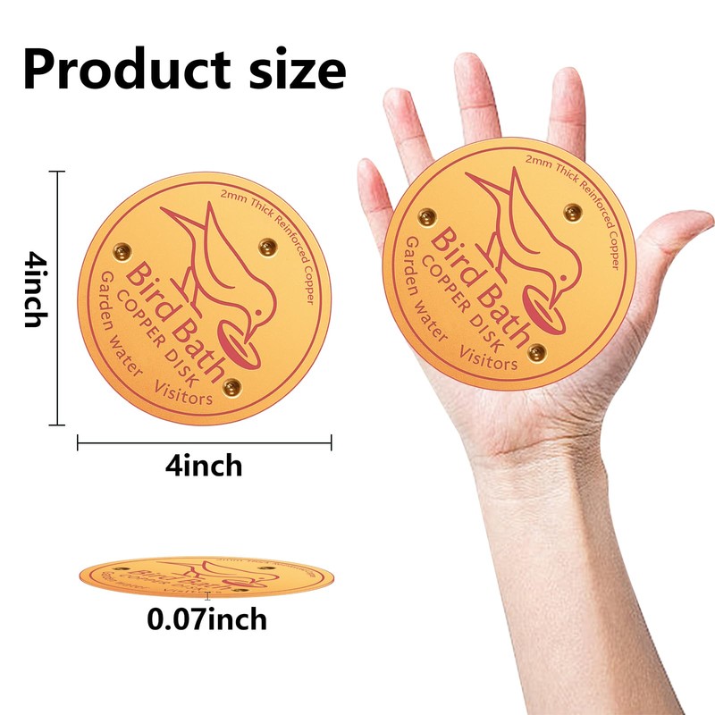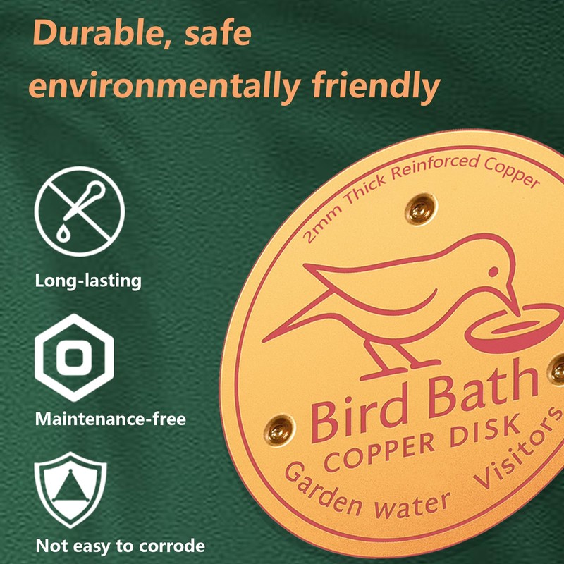 • Effortless Maintenance – This copper disc simplifies bird bath upkeep by naturally inhibiting algae and slime buildup. While routine debris removal and water changes are still needed, deep cleanings become less frequent – just once every week or two.