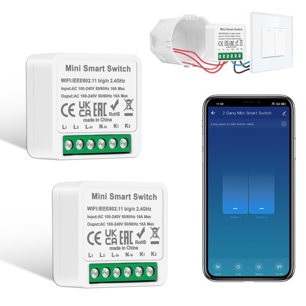 2 PCS CNBINGO Smart Lichtschalter Modul 2 Fach 1 Weg, Mini DIY WLAN Schalter Passt hinter Wandschalter, Smart Switch Kompatibel mit Alexa Echo, Google Home, Smart Life/Tuya, Neutralleiter Erforderlich