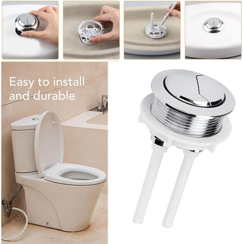 - Adjustable flush toilet button installation steps are very convenient. No drilling or other tools needed, simply open the toilet lid, pull out the old button, and put the new dual toilet button in, screw it up and use it.