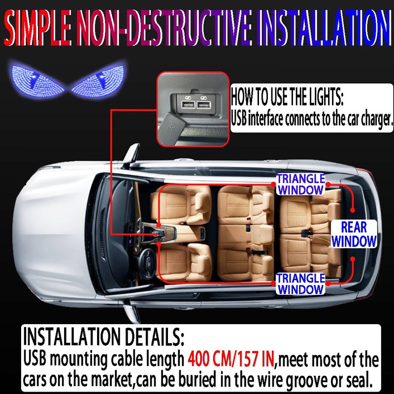 - 🧿3M Adhesive/USB Plug and Play: Cut the 3M double sided tape to the right length,stick it on the mounting position,press the half-devil's eye led light to bond it (please clean the mounting position in advance).GKKBUFF cool half-devil's eye lights adopts the energy-saving 12V/USB interface,plug and play does not need to charge or replace the batteries frequently.4 M (157 IN) of extra-long wires can be buried randomly in the car's center console's USB port.