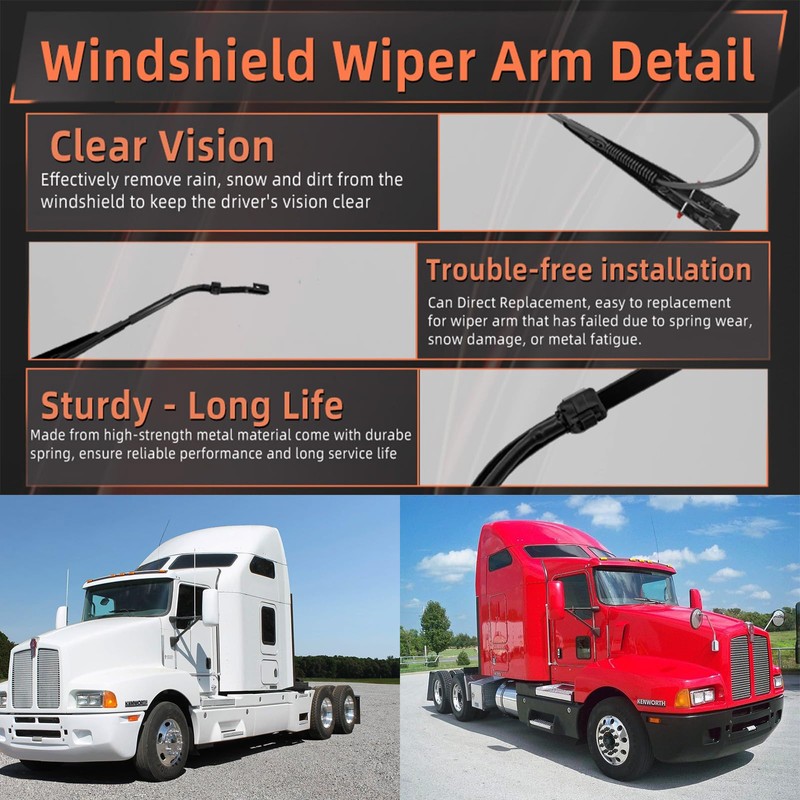 - High durability metal wiper arm:Made of high quality metal materials, corrosion and rust resistant, which is 3 times longer than ordinary plastic wiper arm life. Designed for frequent rain and snow, the high-strength structure ensures long-term use without deformation, perfect for the Kenworth T600/T660/T800/W900 wiper replacement needs.