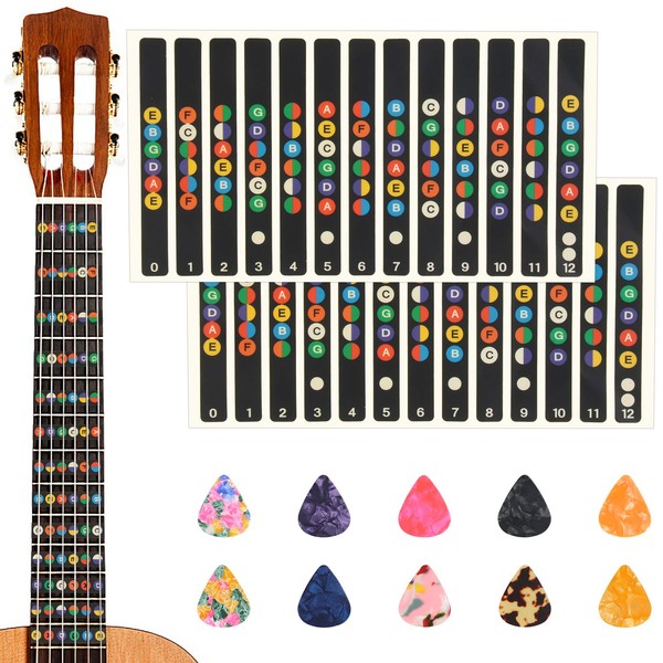 - Package Includes : The package includes 2pcs black guitar stickers fretboard, and 10pcs guitar picks, a useful set that helps guitar beginners get started quickly.