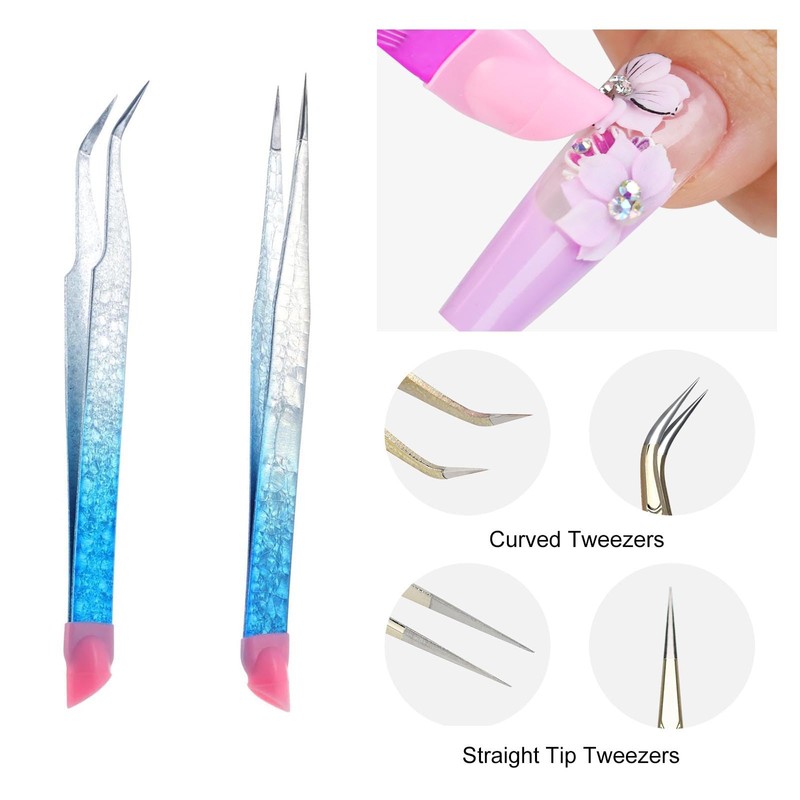 2 Pcs Ice Blue Elegant Nail Art Tweezers, Stainless Steel Tweezers with Silicone Pressing Head, for Eyelash Extensions and Nail Art Sticker Craft Rhinestone Stickers Jewel Gem Picker