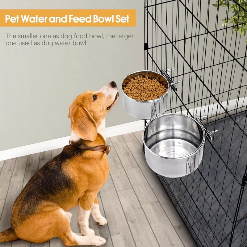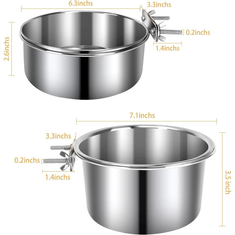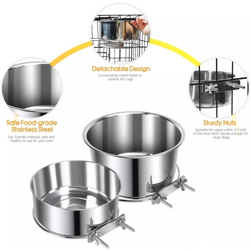 < ul >< li >【 Anti - spill 】: The bowl and holder attach easily and securely to the cage , so your pets can freely get a drink or food without making a mess . You don ' t need to worry the bowl will tip over resulting in your pets being wet . ( Note : Suit for medium and large - breed pets . )< li >【 Durable & Easy to Clean 】: Made of food - grade stainless steel , rust - resistant and safe to use , does not leave any smelly odors . Easy quick cleaning for stainless steel bowls , the bowls are removable for easy clean - up and support washing by dishwasher .< li >【 Save Space & Keep Neat 】: By having the bowls raised off the kennel floor , there is more sleeping area and space for a litter pan . It won ' t wobble or spill , you don ' t have to clean up dumped water dishes every day .< li >【 Easy to Install 】: The mounts are easy to maneuver and are very sturdy to keep the food and water where they should be . Our dog bowls can securely attach to pet crates , cages , or kennels .< li >ul >< li >< span >< span > Why need it ? < p > Very easy to install to the side of the crate and very durable , you don ' t have to concern that if your pet bumped them they would move let alone bend . The pet bowl set can hold enough water and food , satisfy their hydration needs when you are out of the house . < ul >< li >< span >< span > Who need it ? < p > The stainless steel hanging pet bowls are suitable for dogs , cats , rabbits , guinea pigs , ferrets , birds , kittens , puppies , and other small pets . You can choose different size bowl set to satisfy your pet demands in crates and kennels . It ' s great that you can adjust the height as your pet gets bigger . < div > < div > < h3 > Benefits for needing this set of stainless steel hanging pet bowls < p > < span > 1 . Keep the Kennel Clean : < p > Fixed with a clamp holder , the wing nut attachments make the bowl super sturdy , your lovely pets can not dump the bowls , no spill of food or water and less wasted . < p > < span > 2 . Perfect for Playful Pets : < p > Our pet bowls for the cage are a must - have for clumsy puppies and large dogs who love knocking over bowls on purpose , suits most kennels crates and cages < p > < span > 3 . Comfortable for Eating : < p > Attach them to the proper height on the back of the crate allowing your pets to use them easily and without having to bend excessively . < p > < span > 4 . Easy to Clean : < p > They can be removed just as easily . Super easy to clean as well . Just take some water and a sponge and they come out squeaky clean . < div > < div > < div > < table > < tr > < td > < div > < h4 > Premium Quality < p > Made of durable and sturdy stainless steel , dishwasher safe , no worry about your pets will chew it . < td > < div > < h4 > Large Enough < p > The pet bowls are large enough to hold enough food and water for larger dogs . It will satisfy their hydration needs when you are out of the house . < td > < div > < h4 > Easy to Install < p > The bowls are separate from the holders , you can easy to put on or take out the bowls for you to fill and wash them conveniently . You can attach the food feeder inside or outside your pet ' s cage . < div > < div > < h3 > Providing an elevated , spill - proof feeding solution that attaches securely to crates and cages , while being durable for pets .