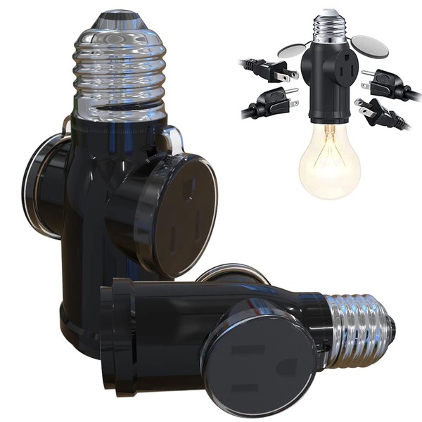 2 Pcs Luntak 3 Prong Light Socket to Plug Adapter, E26 Light Socket Outlet Outdoor, Light Bulb to 2/3 Prong Outlet Socket Splitter Converter Heat-Resistant for Porch Patio Garage Utility Rooms (Black)