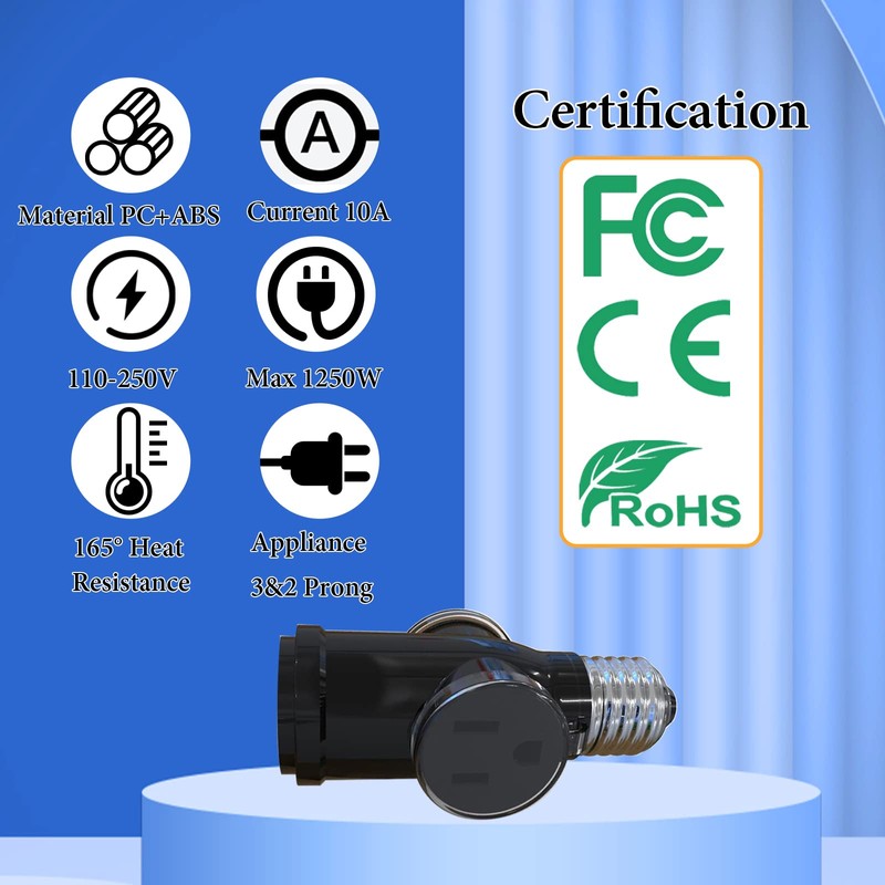 - 【High Quality】Our light plug adapter use of safer quality materials--PC +ABS fireproof material, double insulation, 165 ℃ thermo-resistant and flame retardant. Double security protection, leakage protection. This socket plug adapter has FCC, CE, ROHS certification, max wattage of 1250W , and with a load up to 10 amps, suitable for most equipment.