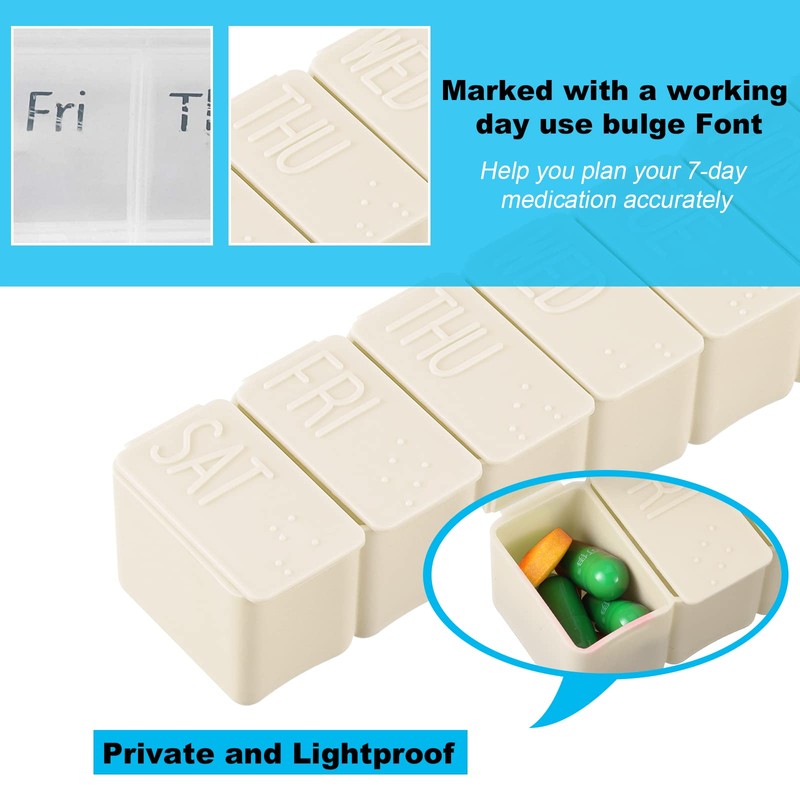 - High-quality Engraving, Convenient to Take by Date: 7-day pill box organiser weekly supplement organiser use special engraving technology to deeply imprint the time of a week on the 7-day medicine box, large weekly pill box 7 day is textured to the touch and equipped with Braille and strictly tested before shipping. Therefore, weekly Pill Box Organiser is very durable, 2 pieces of the 7-day pill box organiser you can distribute two weeks' worth of kits at the same time or share with others.