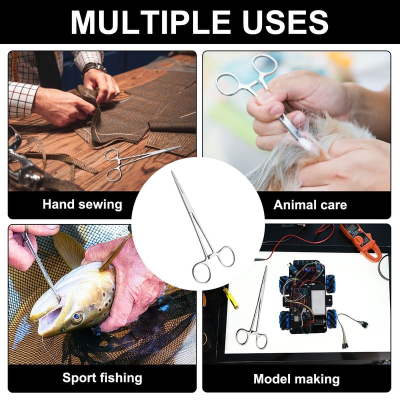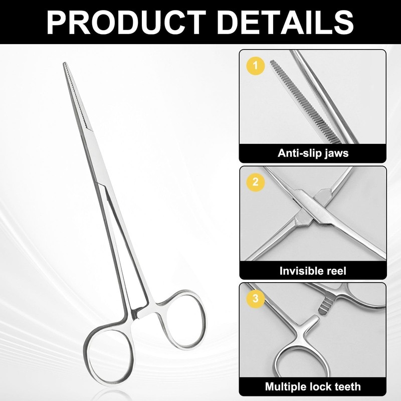 The racks on both sides of the self-locking pliers have a ratchet closure system, which can manually control the spacing between the pliers. The anti slip design is easier to operate and grip. The pliers are made of stainless steel, durable and rust proof, and can be disinfected with salt water and high temperature. This multifunctional tool can be used for various activities such as sewing, fishing, trimming, pet lice removal, electronic product maintenance, reptile feeding, etc. It is an essential tool for medical and veterinary clinics, hospitals, and offices. There are 2 sets of 14cm long hemostatic forceps in the package, which are sufficient to meet your needs.
