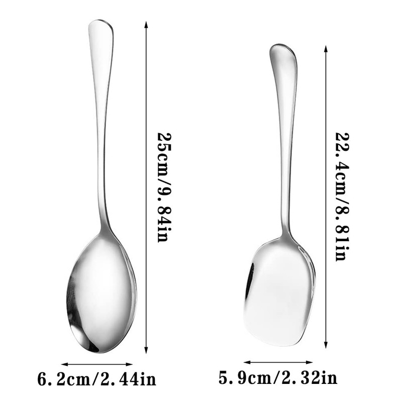 • Size: The serving spoons set measures approximately 25 x 6.2cm/9.84 x 2.44in, 22.4 x 5.9cm 8.81 x 2.32in. These stainless steel serving spoons are perfect for reaching into deep pots and serving hot food